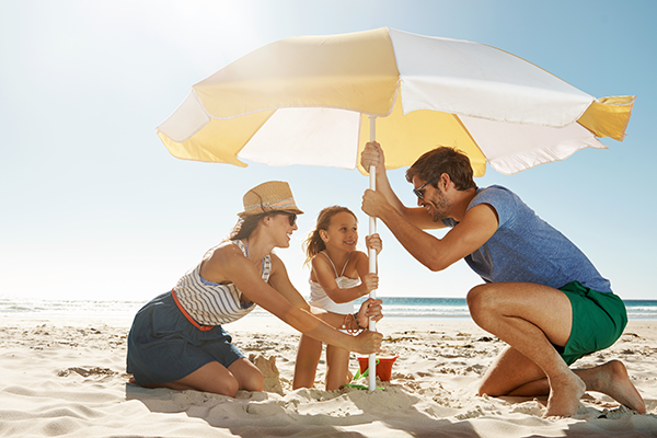 En familj sätter upp ett parasoll på en strand för att barnet ska få skugga.