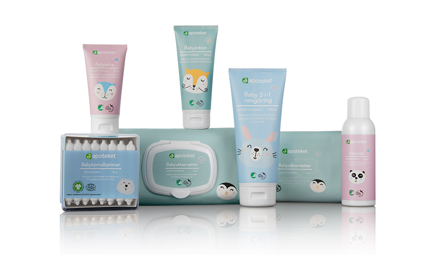Både Apotekets babyserie och serien med barnprodukter pryds av fina illustrationer. Sortimentet har utvecklats med barns hud i fokus och innehåller milda ingredienser.