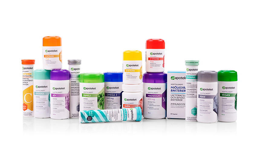 Apoteket har ett eget sortiment av vitaminer och mineraler, tillverkade inom EU med full kontroll över innehåll och tillverkning. På så sätt kan vi försäkra oss om att produkterna lever upp till våra hårda kvalitetskrav, samtidigt som de blir prisvärda för dig.