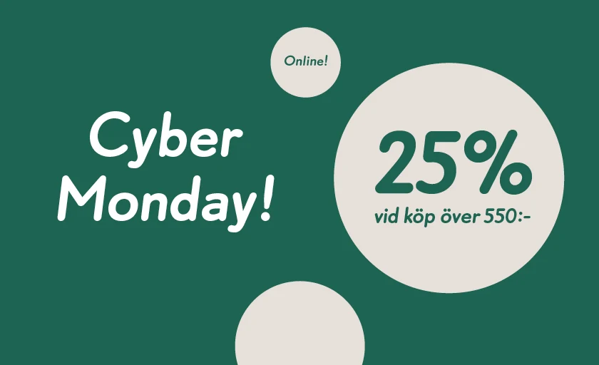 Med koden: CYBERMONDAY får du 25% vid köp över 550 kronor. Erbjudandet gäller endast online under den 1 december. Erbjudandet går inte att kombinera med andra erbjudanden. Gäller ej Ellas kitchen, Medela, Elvie, Baby brezza, Korbell, receptbelagda/ receptfria läkemedel, presentkort eller tjänster.