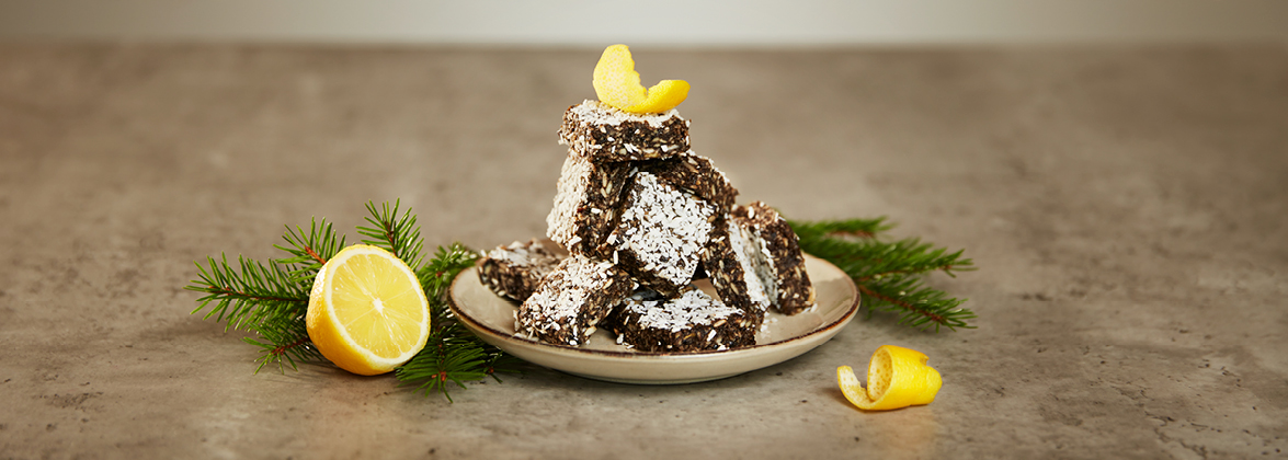 Krossa lakritsstången med mortel och kärna ur dadlarna. Rengör citronen och finriv det yttersta skalet. Häll alla ingredienser i en mixer och kör till önskad konsistens. Lite tuggmotstånd är gott i dessa. Tryck ut degen på bakplåtspapper i t ex en avlång brödform (ca 25x10 cm). Strö några kokosflingor över och ställ in i frysen tills den stelnat. Ta ut och skär i rutor. Klart! Funkar utmärkt att frysa in. Håller i kylskåp ca en vecka.