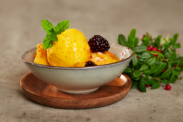 Ta av från plattan och rör ner hackad vit choklad och saffran.