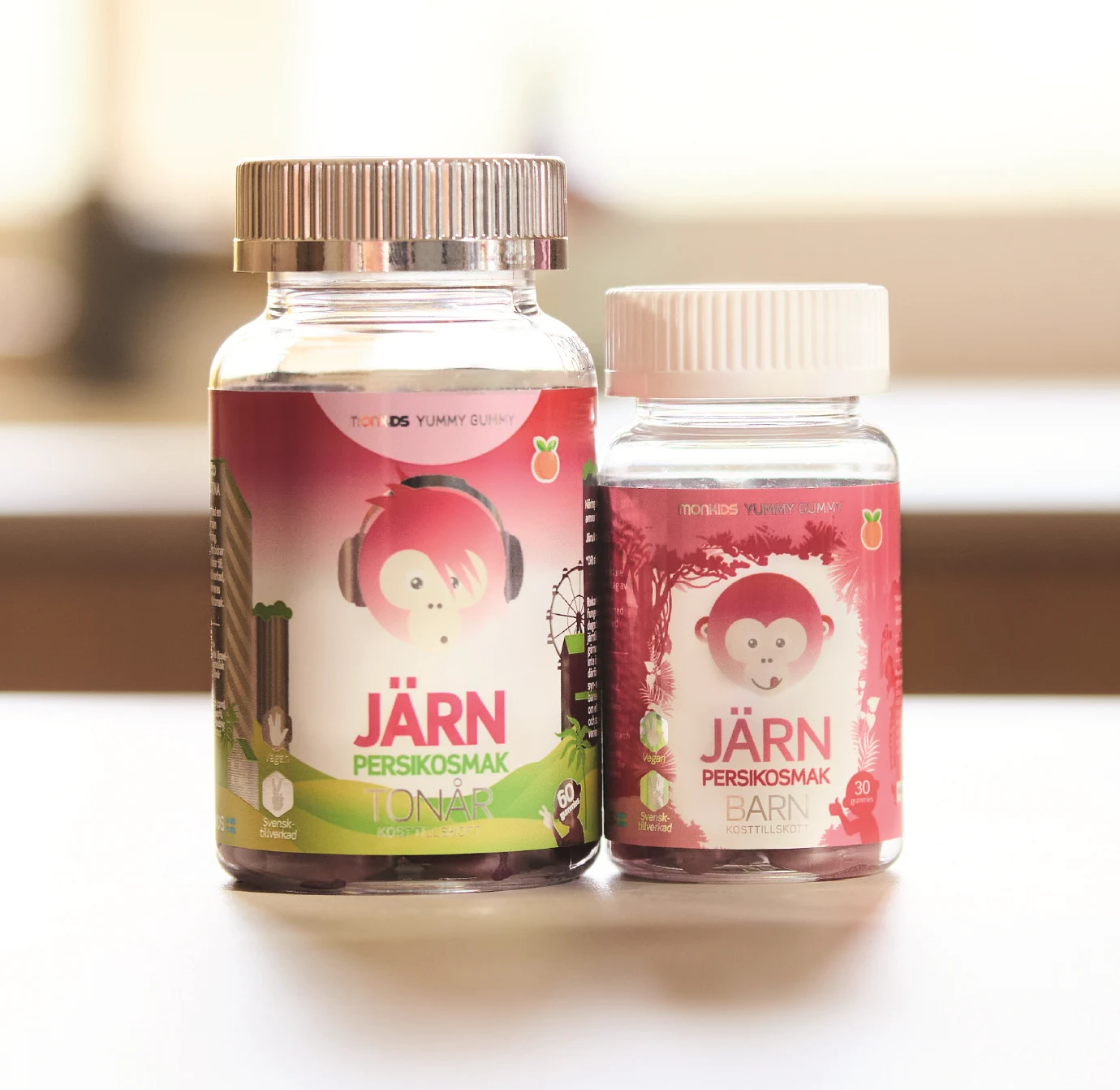 Två burkar järn uppradade bredvid varandra mot en bänkskiva.