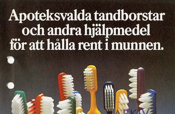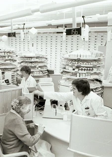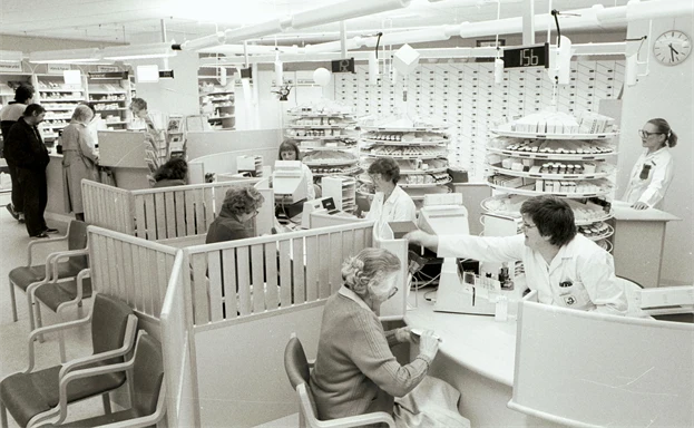 Bild: Expeditionsapoteket Kärnan i Helsingborg juni 1986. Apoteket framhålls som ett exempel på god informationsmiljö. Tre sittande kanaler samt en fjärde, längst bort, där både kunden och den som expedierar är stående. Handköpsdisken ligger intill denna kanal, och det gör det enkelt att växla mellan handköpskunder och receptkunder. Fotograf Olle Djerf.