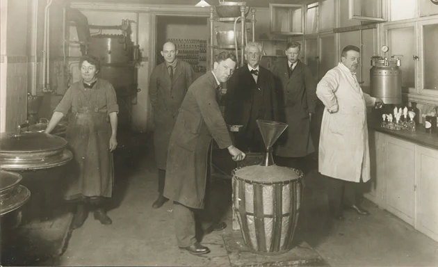 Bild: Apoteket Nordstjernan Drottninggatan i Stockholm under 1920-talet. Verksamhet i laboratorium. Personer från vänster: städerska Lisa, medhjälpare Lövgren, laboratoriebiträde Axel Robert Gustafsson, apotekaren Viktor Everlöv, medhjälpare/elev (namn fattas), laboranten Henning Nöjd.