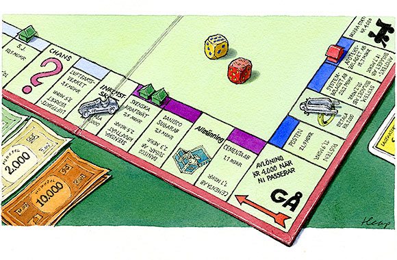 Bild 2: Tecknad bild i original som föreställer allegori över statliga monopolet - med bland annat Posten, Systembolaget och Apoteket. Troligen publicerat någon gång på 1980-1990-talet i Apostrofen. Konstnär Martin Heap.