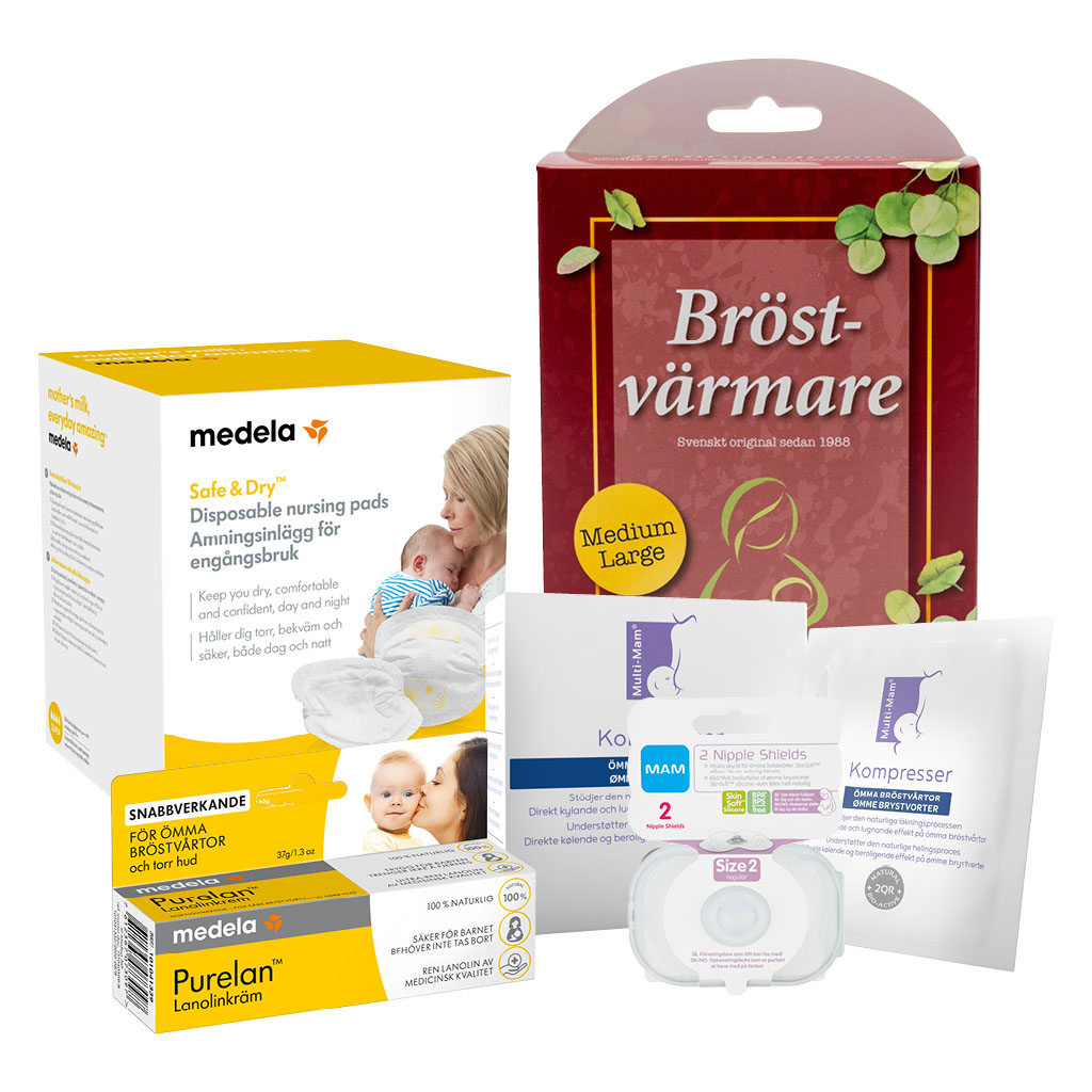 En del mammor får problem med ömma eller såriga bröstvårtor när de ammar. En amningsnapp underlättar, bröstsalva vårdar bröstvårtorna, kompresser minskar svullnad och lindrar. Paketet innehåller även bröstvärmare och amningskupor, som samlar upp läckande mjölk.