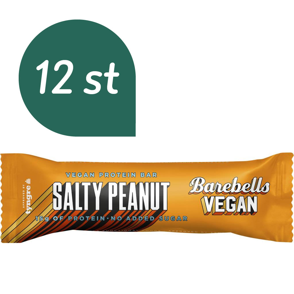 Barebells Vegan Protein Bar Salty Peanut är en vegansk proteinbar med choklad och jordnötter. Baren innehåller 15 gram protein, inget tillsatt socker.