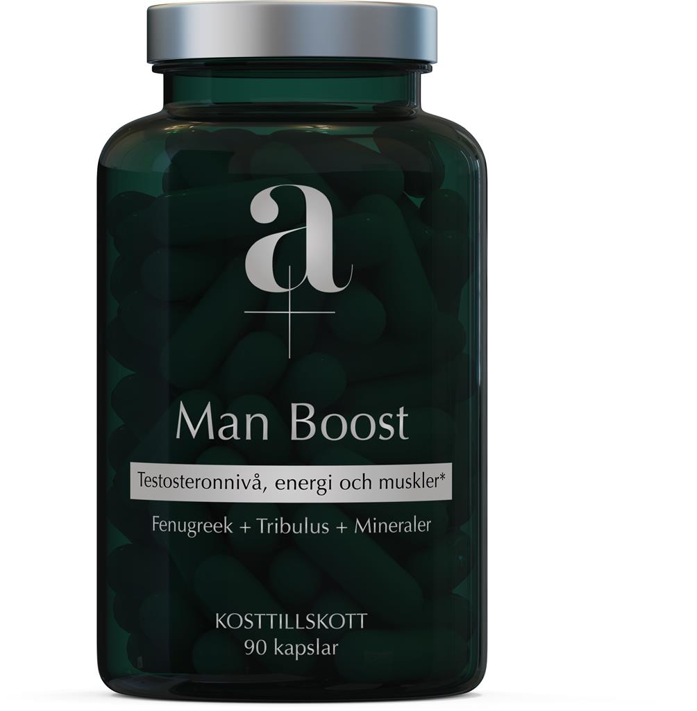 A+ Man Boost är ett kosttillskott som speciellt utvecklad för man. A+ Man Boost innehåller bland annat ”ZMA”, som står för zink, magnesium och B6, en populär kombination i tillskott riktade till män. Magnesium bidrar bland annat till att reglera muskler, upprätthålla ben och tänder, bidrar till minskad trötthet och utmattning, samt bidrar till normal energiomsättning. Zink bidrar till att bibehålla normala testosteronnivåer i blodet medan B6 bidrar till att reglera hormonaktiviteten. Kosttillskottet innehåller även örterna bockhornsklöver och tiggarnöt med ett rikligt innehåll av saponiner samt Rosenrot och Maca.