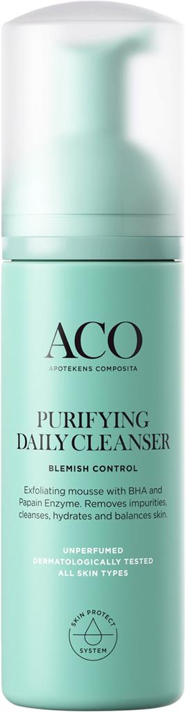 ACO Face Purifying Cleanser är en mild ansiktsrengöring i mousse som effektivt avlägsnar orenheter och smink utan att torka ut huden. Formulan innehåller BHA som exfolierar varsamt och hjälper till att hålla porerna rena, samt enzymet papain som exfolierar och bidrar till en jämnare hudyta. Rengöringen återfuktar huden och lämnar den fräsch och balanserad efter användning. Passar alla hudtyper och är särskilt framtagen för vuxna med tendens till finnar, även känslig hud. Dermatologiskt testad, icke‑komedogen och oparfymerad.