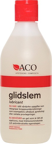 ACO Glidslem är en friktionsminskande gel med bakteriehämmande egenskaper. Stryk en lagom mängd glidslem på undersökningsstället. Följ anvisningarna på produkten/bruksanvisningen.