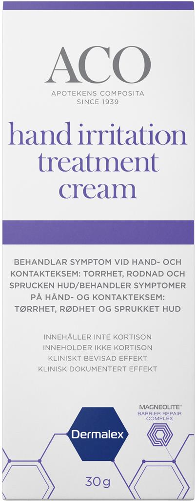 ACO Hand Irritation är en kortisonfri kräm särskilt anpassad för behandling av milda till måttliga besvär av hand- och kontakteksem. Den skonsamma krämen minskar symptom såsom klåda, torrhet, rodnad och sprickor i huden som orsakas av irritation och allergiska reaktioner. Produkten mjukgör huden intensivt genom att återställa hudens fetter samt motverkar nya eksemutbrott. ACO Hand Irritation har kliniskt bevisad effekt.