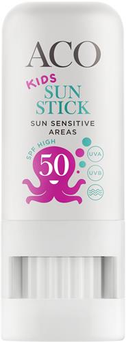 ACO Kids Sun Stick SPF 50 är ett återfuktande solstift särskilt anpassat för barns känsliga hud. Stiftet ger omedelbart skydd mot solens UVA- och UVB-strålar på extra utsatta hudområden som t ex läppar, näsa, kinder och öron.       ACO Kids Sun Stick SPF 50 är lätt att ta med och enkelt att applicera. Dessutom är det fritt från alkohol och färgämnen samt är extra vattenresistent.   ·         Extra vattenresistent ·         Känslig hud ·         Dermatologiskt testad ·         Oparfymerad   Förvaras i normal rumstemperatur        Fetthalt 73%        Innehåll: Petrolatum, Ozokerite, C12-15 Alkyl Benzoate, Cetearyl Alcohol, Diethylamino Hydroxybenzoyl Hexyl Benzoate, Bis-Ethylhexyloxyphenol Methoxyphenyl Triazine, Ethylhexyl Salicylate, Canola Oil, Titanium Dioxide (nano), Ethylhexyl Triazone, Tocopheryl Acetate, Copernicia Cerifera Cera, Butyl Methoxydibenzoylmethane, Alumina, Simethicone, Silica, Citric Acid