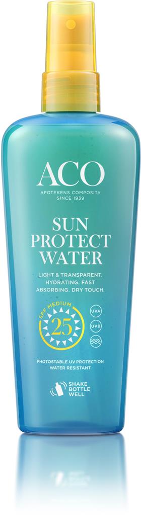 Aco Sun Protective Water SPF 25 är en intensivt återfuktande, transparent och lätt solspray som ger omedelbart skydd mot solens UVA- och UVB-strålar. Absorberas snabbt utan att kladda, och lämnar huden silkeslen. Den är vatten- och svettresistent. Anpassad för alla hudyper, även känslig hud. Dermatologiskt testad. Innehåller ACO:s Triple Moist Complex som ger omedelbar, intensiv och långvarig återfuktning djupt in i huden. Med Hyaluronsyra.