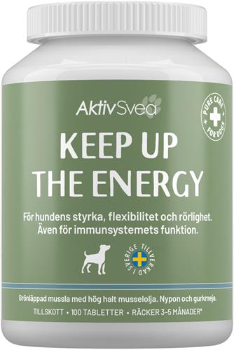 AKTIV® ENERGY  är ett svensktillverkat kompletteringsfoder som främjar rörliga och hälsosamma leder hos hund och katt.   AKTIV® ENERGY  ger energi och vitalitet till din pälskling samt är även gynnsamt för dess hud och päls.   -          Innehåller Nypon, Gurkmeja och Grönläppad mussla -          Räcker i ca 3 månader för mellanstor hund -          Tabletten är tuggvänlig, del- och krossbar med smakgaranti -          Svensktillverkat -          Enbart naturliga ingredienser     Hållbarhet och förvaring: Torrt i rumstemperatur   Bruksanvisning: AKTIV® ENERGY kan användas kontinuerligt som ett dagligt tillskott eller under perioder av ökat behov. Tabletten är del- och krossbar och en burk räcker i ca 3 månader för medelstor hund. Vid behov, gärna i början av användningen eller vid hård belastning, kan doseringen ökas för att därefter minskas. Dosering: Small >15 kg: 0,5 tablett; Medium 15-25 kg: 1 tablett; Large 25-45 kg: 1,5 - 2 tabletter.   Innehåller nypon, gurkmeja samt grönläppad mussla som har ett naturligt innehåll av glykosaminoglykaner (GAG) och Omega-3 (EPA, DHA, ETA). Fodret är även förstärkt med vitamin C