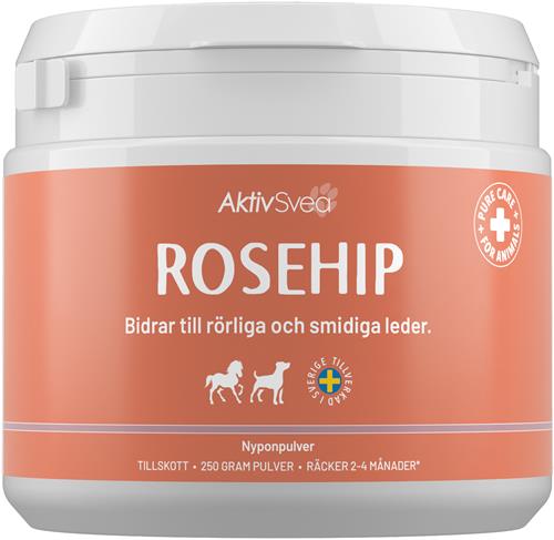 Aktiv Nypon är ett 100 % vegetabiliskt svensktillverkat fodertillskott för hund och häst. Det passar alla men är extra gynnsamt för äldre djur som ofta har problem med stela leder.     Aktiv Nypon kan användas ensamt eller i kombination med exempelvis grönläppad mussla, t ex Aktiv Energy och Aktiv Hund.   Aktiv Nypon ökar rörligheten och bidrar till att bibehålla hälsosamma och rörliga leder. Det kan användas kontinuerligt eller under perioder av ökat behov. Pulvret kan blandas i mat och vätska.     -          Svensktillverkat fodertillskott med smakgaranti -          Pulvret kan blandas i mat och vätska och har smakgaranti -          Kan användas vid besvär eller förebyggande -          För hund och häst     Bruksanvisning: Pulver som enkelt blandas ut i mat för hund och häst. Dosering: Small (<15 kg) - 1 tsk/dag; Medium (15-30 kg) - 2 tsk/dag; Large (>30 kg) - 3 tsk/dag. Doseringen kan ökas vid behov.   Förvaras torrt i rumstemperatur.