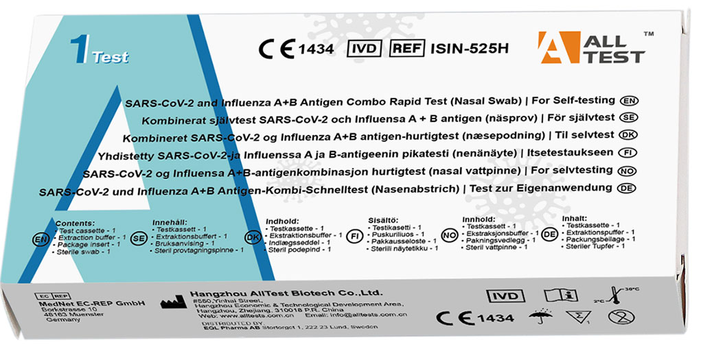 AllTest Kombi självtest SARS-CoV-2 och Influensa A + B antigen 1-pack är marknadens första kombinationstest för detektering av Covid-19 och/eller Influensa A+B. AllTest "Combo-3" Covid-19 självtest med Influensa A + B är ett testkit för engångsbruk avsett att detektera både coronaviruset SARS-CoV-2 som orsakar Covid-19 och influensavirus A och B. Provtagning sker via nasalt test.