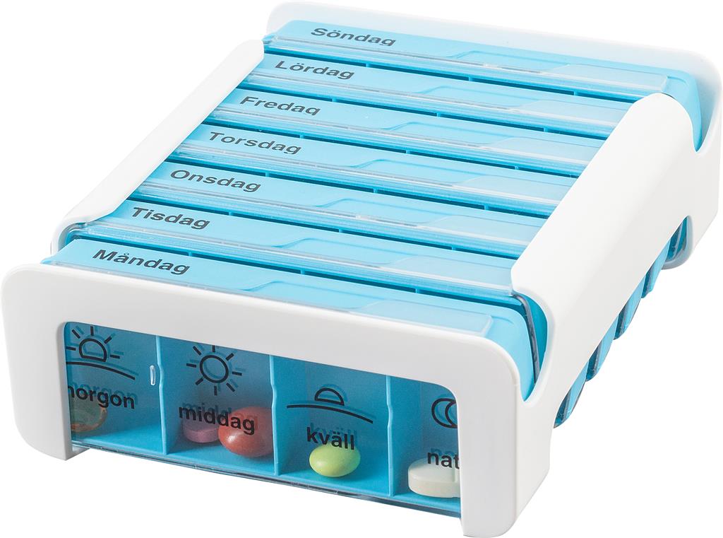 De dagliga askarna gör det lätt att ta med sina mediciner i den dagliga rutinen. Den passar i jacka/kavaj eller väska. Asken är byggd så att asken inte öppnas ofrivilligt och tabletter blandas ihop.