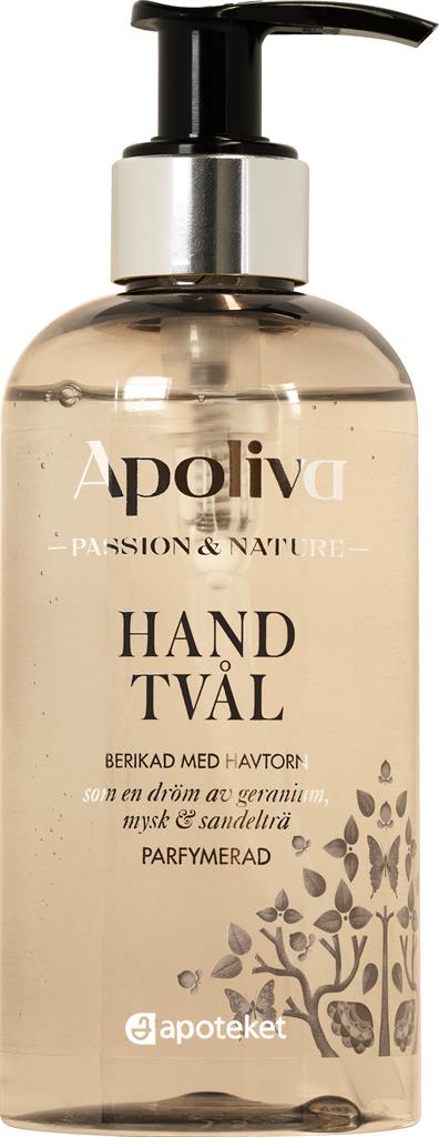 Apoliva Passion & Nature handtvål med doft av geranium, mysk & sandelträ är en mjukgörande och mild handtvål med havtorn. Rengör huden skonsamt och lämnar händerna mjuka och väldoftande. Den ljuvliga doften bär toner av geranium, mysk & sandelträ.