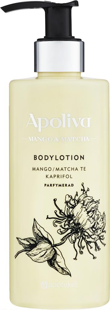 Apoliva Mango & Matcha bodylotion är en mjuk och skön bodylotion med härlig doft. Huden får fukt och näring tack vare mangoolja, rapsolja och mandelolja. Matcha te vårdar och skyddar huden och har ett högt innehåll av polyfenoler som är rika på antioxidanter. Kaprifolextrakt lugnar och vårdar huden och glycerin ger en intensiv återfuktning. Kommer i flaska med hygienisk pump.