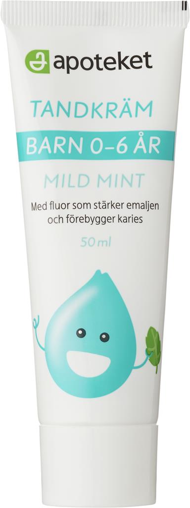 Apoteket Barntandkräm är en mild tandkräm speciellt utvecklad för barn 0-6 år. Den är utvecklad för att stärka emaljen och förebygga karies. Dessutom rengör den skonsamt och löddrar mindre än en tandkräm för vuxna. Tandkrämen innehåller fluor (1000 ppm F), har låg slipverkan och anpassat pH-värde (ca 7). Vegansk. Mild mintsmak. 50 ml.