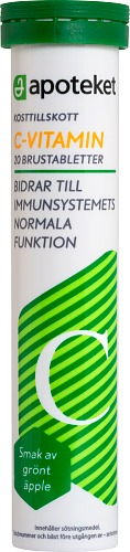 Apoteket C-vitamin brustablett är ett kosttillskott innehållande C-vitamin. Apoteket C-vitamin finns i 5 olika smaker: apelsin, citron, grönt äpple, blåbär och ingefära/apelsin. Vegansk.