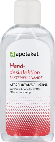 Apoteket Handdesinfektion är ett alkoholbaserat desinfektionsmedel i gelform. Denna handdesinfektion har effekt på bakterier, virus och svamp. Apoteket Handdesinfektion verkar snabbt och varken klibbar eller doftar efter avdunstning. Handspriten innehåller glycerin som återfuktar huden och förhindrar uttorkning. Glycerinet i Apotekets Handdesinfektion kommer inte från animaliskt ursprung. Den innehåller 70 w/w% denaturerad etanol.