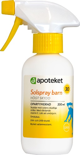 Lättapplicerad spray som skyddar barns hud mot UVA/UVB-strålning. Applicera två lager för full effekt