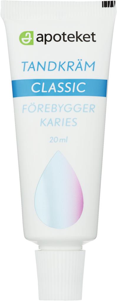 Apoteket Tandkräm Classic innehåller fluor som förebygger karies. Vegansk. Mintsmak. Finns både i tub om 100 ml samt i praktiskt reseformat om 20 ml.