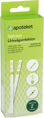 Apoteket Självtest Urinvägsinfektion är ett enkelt hemmatest som upptäcker tydliga tecken på urinvägsinfektion. Testet görs snabbt och enkelt hemma. Testsvaret avläses efter ca 2 minuter. Testet ger utslag för leukocyter, nitrit och protein i urinen.