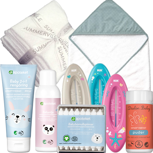 Många bebisar älskar att bada, helst i ljummet vatten. Kolla att det är lagom varmt (ca 37°) med termometern. Baby 2-i-1 rengör varsamt, några droppar babyolja gör huden mjuk och len och badcapen får den lilla att se ut som en superhjälte efter badet. Tvättlappar och bomullspinnar ingår.
