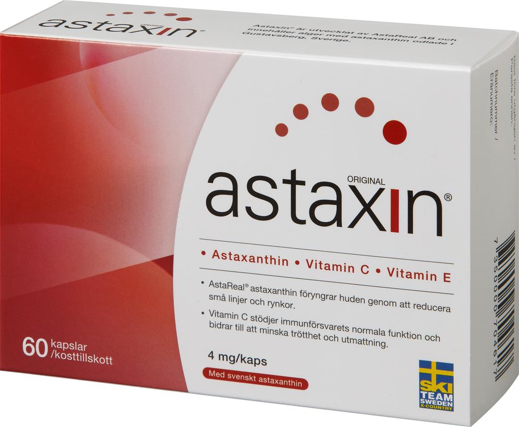 Astaxin är ett kosttillskott som är en kombination av antioxidanterna vitamin C och vitamin E som bidrar till att skydda cellerna mot oxidativ stress. Vitamin C bidrar till normal energiomsättning, immunsystemets normala funktion, normal kollagenbildning som har betydelse för hudens normala funktion, för att minska trötthet och utmattning samt ökar upptaget av järn. Kosttillskott ersätter inte en varierad kost utan bör kombineras med en mångsidig och balanserad kost samt en hälsosam livsstil.