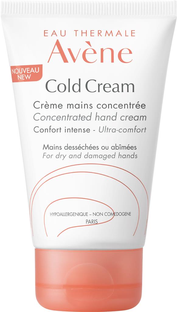 Avène Cold Cream Concentrated Hand Cream är en vårdande handkräm som reparerar och återfuktar dina händer och gör dem mjuka och smidiga igen. Den verkar mjukgörande och skyddande på narig och sprucken hud och underlättar läkningen.    Avène Cold Cream Concentrated Hand Cream går lätt in i huden och har en mild doft.   -          Lättabsorberande -          Lätt parfymerad -          Reparerar och återfuktar samt lugnar irriterad hud -          Utan parabener   Från 3 år.   Hållbarhet och förvaring: 3 år från tillverkning. Öppen burk symbol 12 mån.   Innehåll med funktion (ämnen behöver inte förklaras i detalj, ingen tabell utan endast ämnen) AVENE AQUA, GLYCERIN, PARAFFINUM LIQUIDUM, CAPRYLIC/CAPRIC TRIGLYCERIDE, CETEARYL ALCOHOL, POLYMETHYL METHACRYLATE, GLYCERYL STEARATE, ALUMINUM SUCROSE OCTASULFATE, PEG-100 STEARATE, CERA ALBA, BENZOIC ACID, BISABOLOL, CAPRYLYL GLYCOL, CETEARYL GLUCOSIDE, CETYL ALCOHOL, PARFUM, HYDROXYPROPYL GUAR, SODIUM HYDROXIDE, AQUA