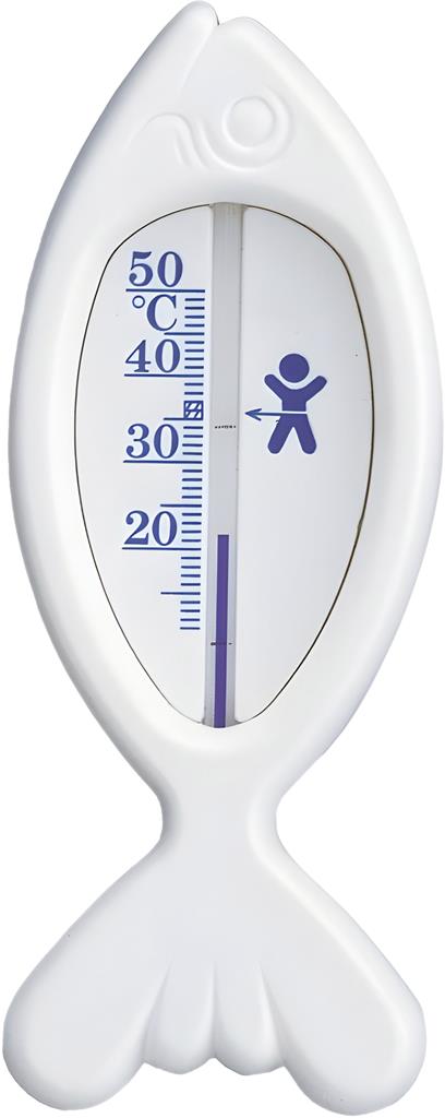 Rolig badtermometer formad som en fisk. Lättläst skala. Vätskan i termometern består av naturlig rapsolja. Färg vit
