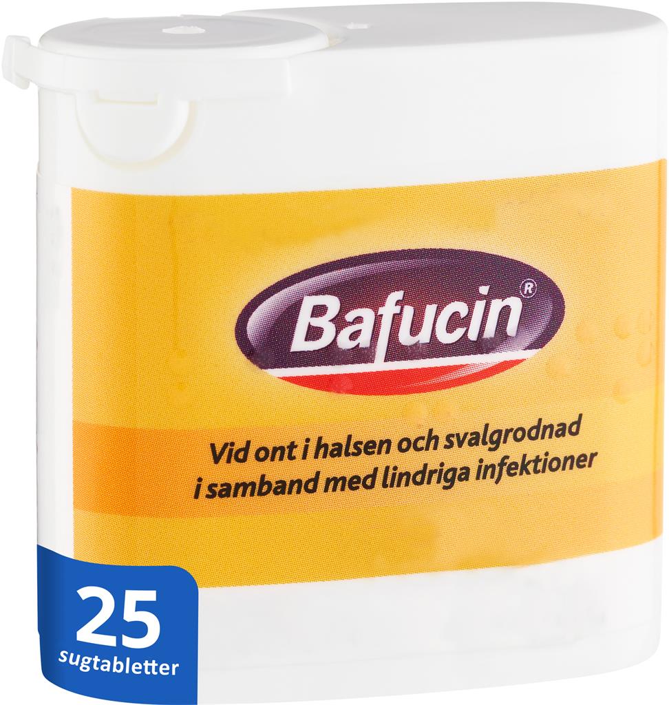 Bafucin med smak av anis och mentol, är en bakteriehämmande och lokalbedövande sugtablett som används vid halsont och rodnad i svalg i samband med lindriga infektioner i munhåla och svalg. Bafucin innehåller bensokain som verkar lokalt bedövande, gramicidin som är ett antibiotikum, samt cetylpyridiniumklorid och diklorobensylalkohol som verkar lokalt mot bakterier. Läs alltid bipacksedeln noga eller gå in på fass.se för mer information.