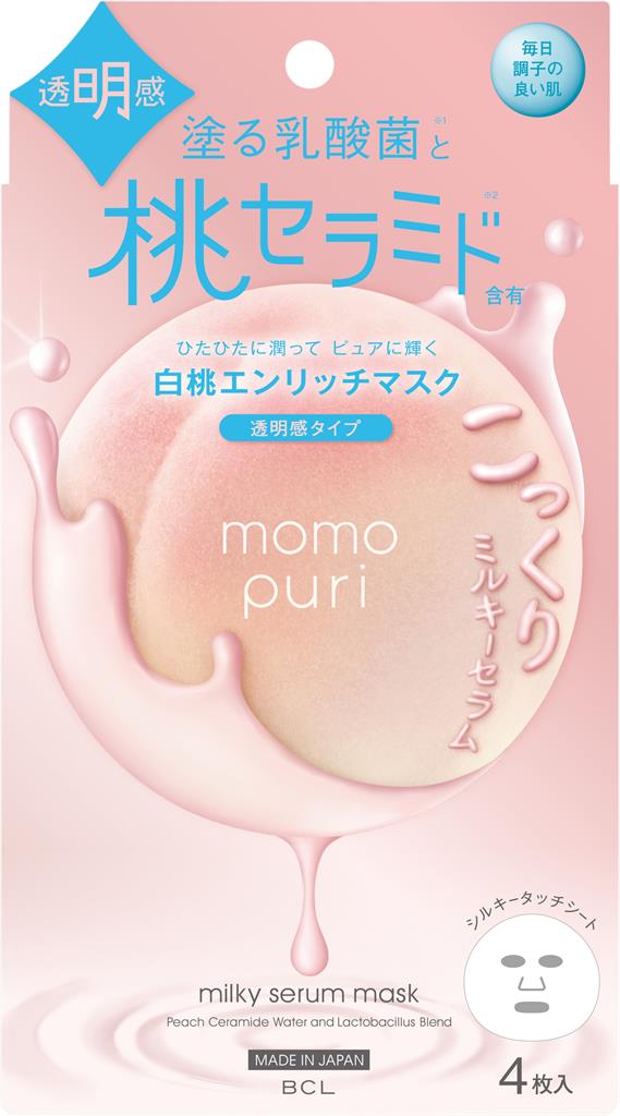 BCL Momopuri Milky Serum Mask är en silkeslen arkmask/sheetmask med persikaceramid tillverkad av