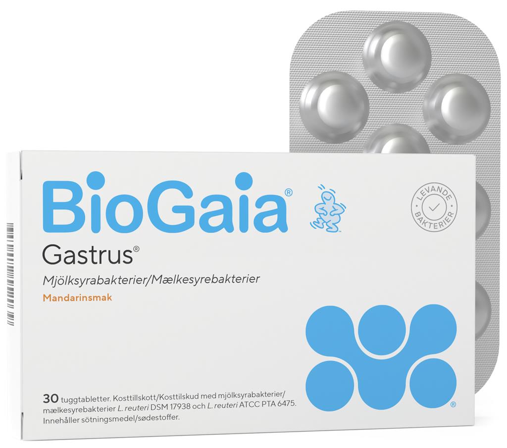 BioGaia Gastrus är ett kosttillskott med mjölksyrabakterier som är framtaget för att hjälpa till att balansera tarmfloran. Probiotika för mage och tarmhälsa i form av tuggtabletter med god mandarinsmak. Kliniskt bevisad att överleva i mag-tarmkanalen och säker för långvarig daglig användning. Gastrus innehåller två patenterade bakteriestammar: L. reuteri* DSM 17938 och L. reuteri ATCC PTA 6475. Probiotiska produkter med L. reuteri DSM 17938 är bland de mest studerade i världen, med över 200 studier på mer än 19 000 personer.