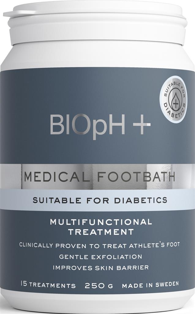BIOpH+ medicinskt fotbad är ett granulat som blandas i ljummet vatten och används som fotbad. Reducerar symtomen vid fotsvamp (hudrodnad, huderosioner, maceration, klåda, stickande känsla, hyperkeratos och odör), hälsprickor och förhårdnader.  Lämplig för diabetiker.