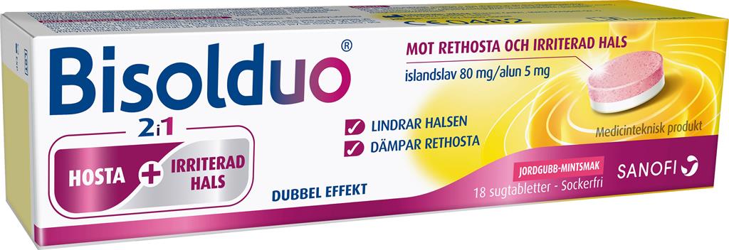 Bisolduo kan bidra till att dämpa hostan och lindra och skyddar halsen. Extraktet i Bisolduo kommer från islandslav som kan verka lugnande för slemhinnan i halsen. Laven fungerar som en skyddshinna på den irriterade slemhinnan och kan skydda mott ytterligare irritation. Bisolduo innehåller också alun, som genom sin sammandragande effekt kan fungera som en barriär mot bakterier och virus och därför hjälpa till att skydda din hals mot ytterligare obehag och irritation.