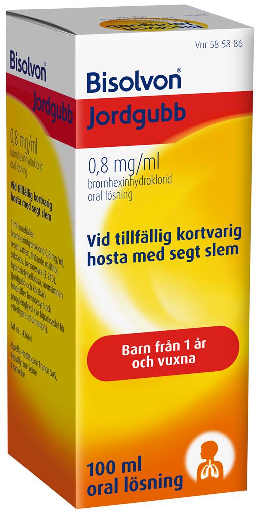 Bisolvon® Jordgubb används vid tillfällig hosta med segt slem. Produkten innehåller bromhexin, som gör slemmet mer tunnflytande och underlättar upphostning. Lösningen har god smak av jordgubb och är anpassad för barn.