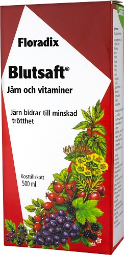 Blutsaft flytande järn och vitaminer är ett kosttillskott som innehåller en organisk och lättabsorberad typ av järn - järnglukonat. Blutsafts järntillskott innehåller även örtextrakt, B-vitaminer samt C-vitamin i form av fruktjuicer som bidrar till att förbättra upptaget av järnet. Järn bidrar till att minska trötthet och utmattning. För vuxna och barn över 6 år.