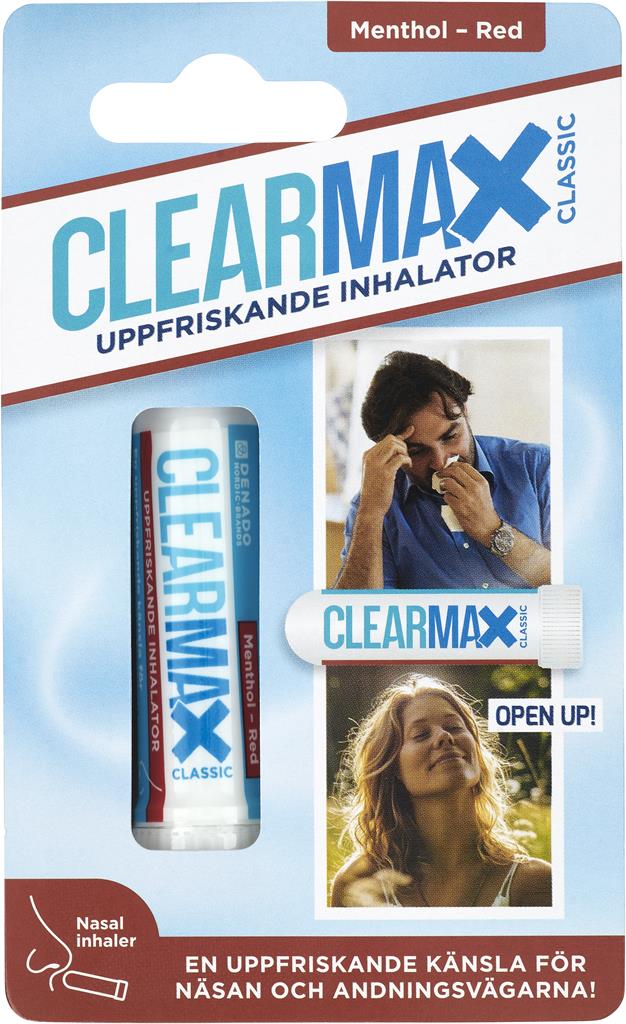 Clearmax Classic Strawberry är ett stift med jordgubbsmak som andas in i näsborrarna för en uppfriskande känsla. Clearmax Inhalator kan exempelvis användas vid nästäppa, vilket gör den lämplig att använda vid förkylning. Clearmax Inhalator passar både vuxna och barn över 6 år.