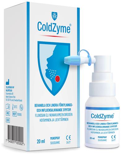 ColdZyme® munspray är en produkt som lindrar och behandlar förkylnings- och influensaliknande symptom. ColdZyme används vid exponering för förkylningsvirus eller i ett tidigt skede när förkylningssymtom uppträder. Produkten kan användas av vuxna och barn från 4 år. Sprayen är fri från socker, konserveringsmedel, gluten och laktos och har smak av mentol.