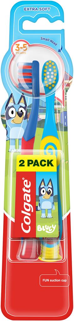 Colgate Bluey tandborste för barn 3-5 år, 2-pack, är gjorda med extra mjuka borststrån för en effektiv och skonsam rengöring.
