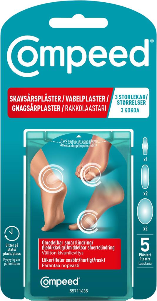 COMPEED skavsårsplåster Mix innehåller plåster i tre storlekar för att passa olika områden på foten. Plåstren fungerar som en skyddande barriär, ger smärtlindring och tryckavlastning mot friktion samt skydda området mot smuts och bakterier. Plåstret är avsett att sitta kvar tills det börjar lossna av sig självt. Perfekt för hela familjen och att ha i första hjälpen lådan.