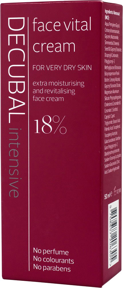 Decubal face vital cream, en ansiktskräm för torr hud med särskilt behov av näring och återuppbyggnad. Intensivt fuktgivande och vårdande för huden i ansiktet. Innehåller ett flertal aktiva ingredienser som hjälper huden att återuppbyggas inifrån, bla hudidentisk ceramidblandning, E-vitamin, sheasmör och vitamin B3.  Decubal face vital cream tränger snabbt in i huden och lämnar en matt yta.
