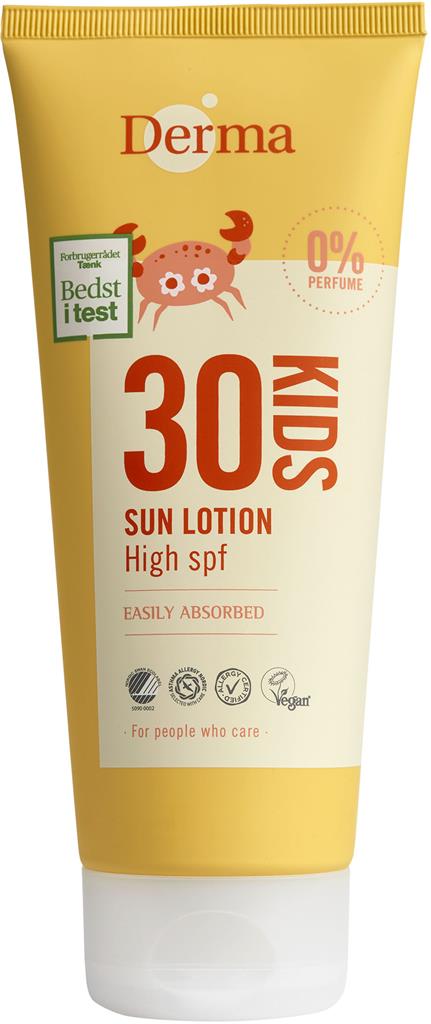 Sun Lotion Kids SPF30 från Derma är en sollotion med högt solskydd som passar både barn och vuxna med känslig hud. Den är vattenresistent och ger skydd mot UVA- och UVB-strålning i enlighet med EU-rekommendationer. Formulan har en lätt konsistens som går snabbt in i huden utan att kännas kladdig.