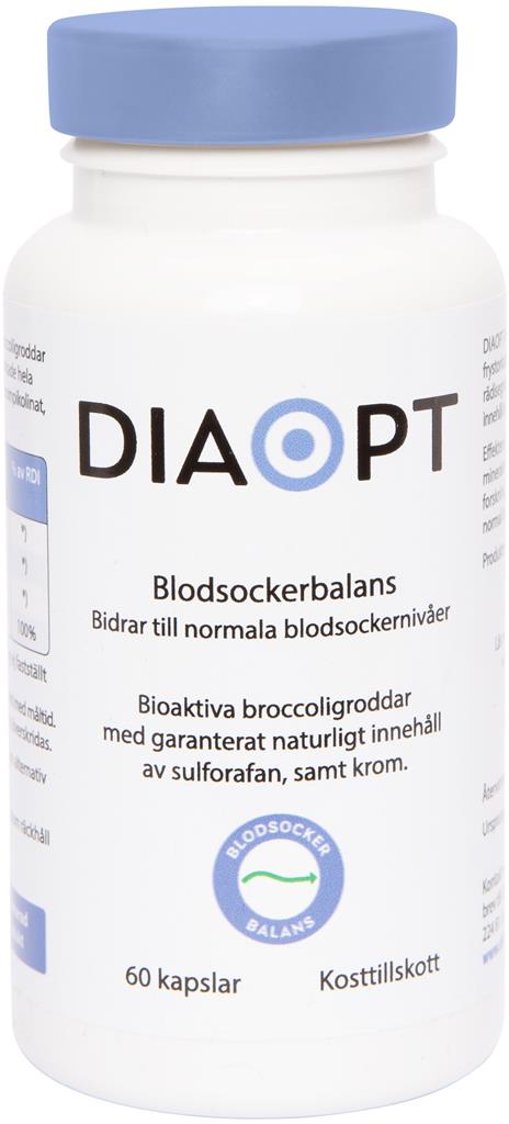 DIAOPT Blodsockerbalans är ett patenterat, svensktutvecklat kosttillskott med frystorkade broccoligroddar, med garanterat innehåll av fytonäringsämnet sulforafan, och rädisegroddar. Produkten innehåller krom, som bidrar till att bibehålla normala blodsockernivåer.