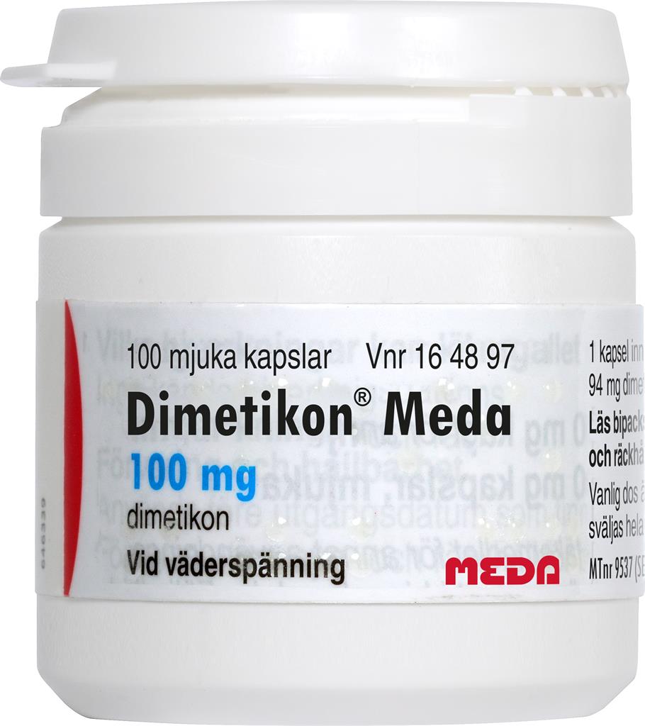 Beskrivning Dimetikon Meda 100 mg har en så kallad ytspännningsnedsättande effekt, vilket gör att skum och bubblor i tarmkanalen som bildats av nedsvald luft försvinner. Dimetikon Meda tas inte upp av kroppen utan verkar enbart i tarmen. Dimetikon Meda används vid väderspänning, det vill säga, ansamling av gaser i tarmarna. Läs alltid bipacksedeln noga eller gå in på fass.se för mer information.   Användning & Dosering