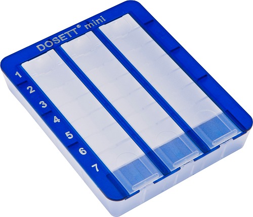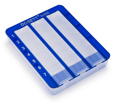 Dosett Mini innehåller 21 fack för mindre tabletter och kan således förberedas för 3 intagningstillfällen per dag i 7 dagar eller upp till 3 veckors behov med ett intagningstillfälle per dag.